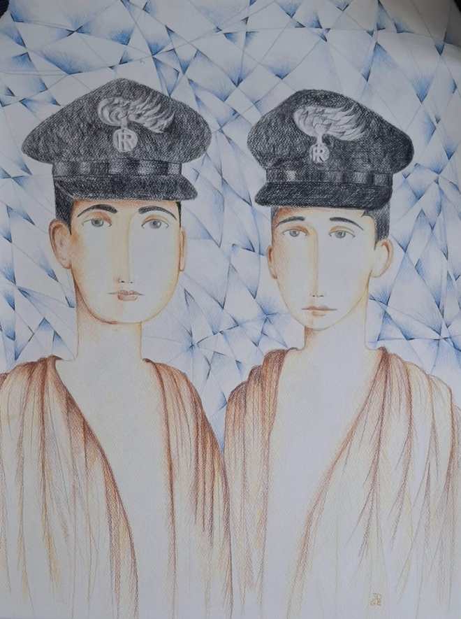 Nell’opera, le vesti dei carabinieri assumono le sembianze delle Dolomiti, tipiche formazioni montuose dei luoghi dove prestavano servizio. Nel cielo è rappresentato il volo di uccelli migratori per rappresentare il cambiamento, passaggio verso una nuova vita.